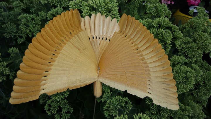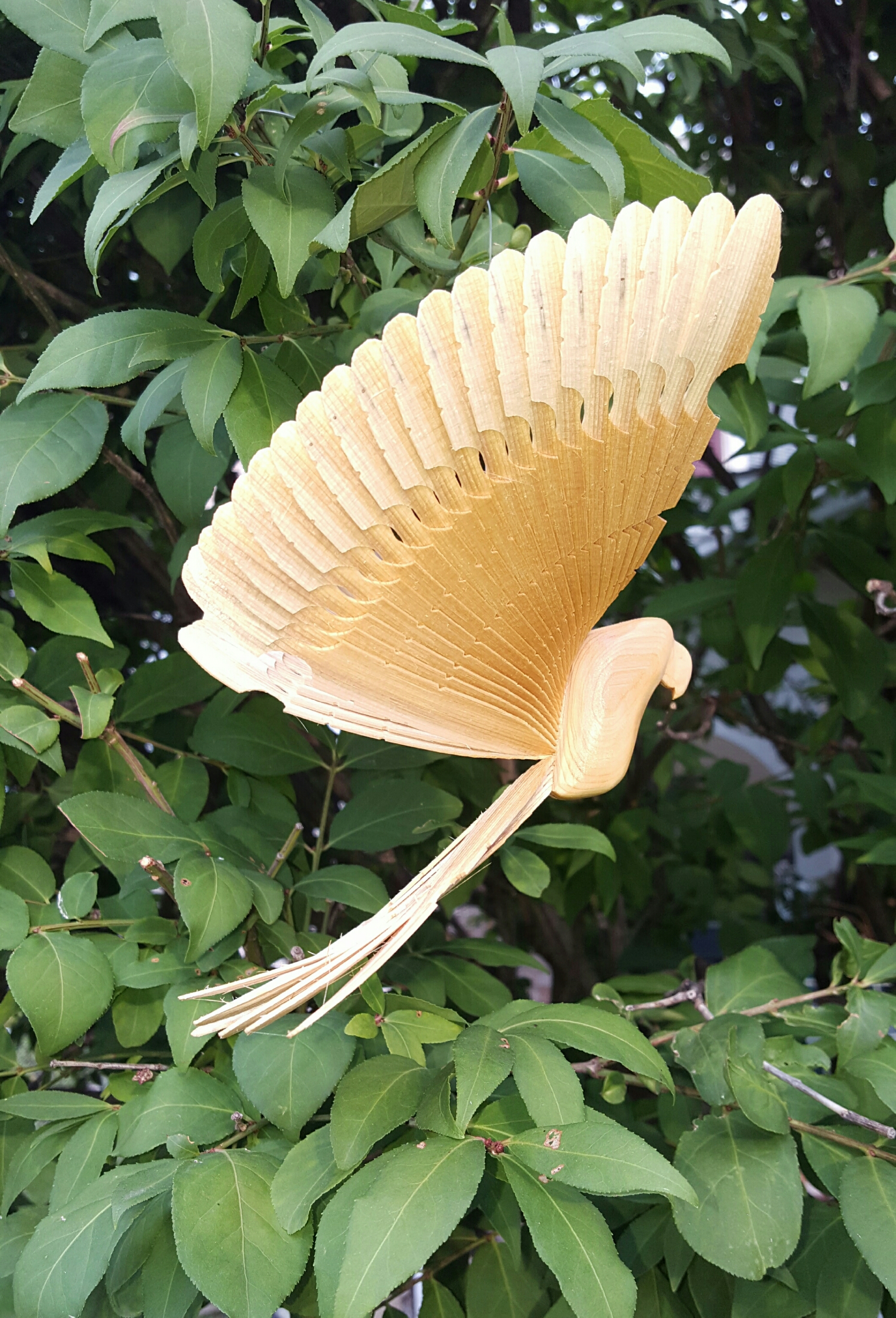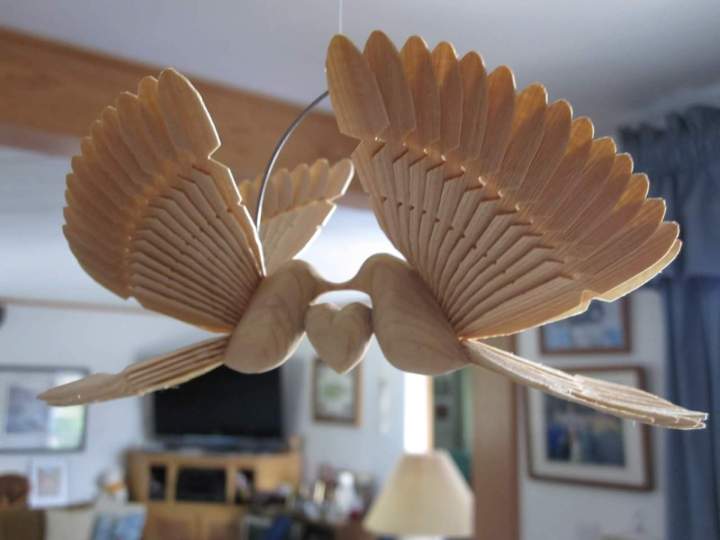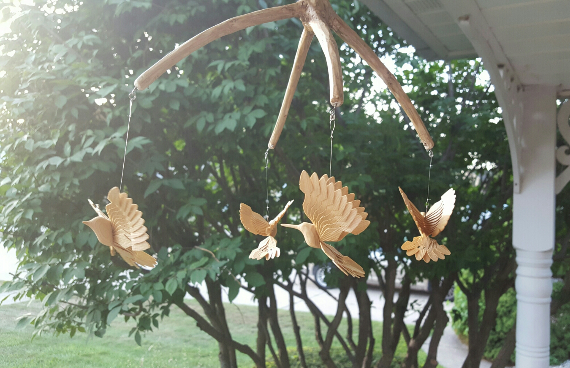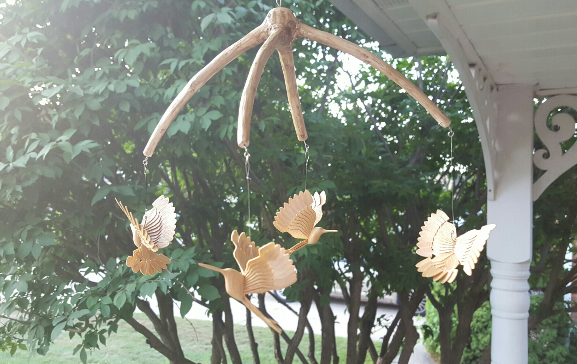 I used the top of an ash tree to make this mobile with 4 little fan birds